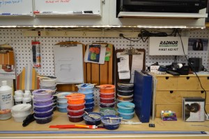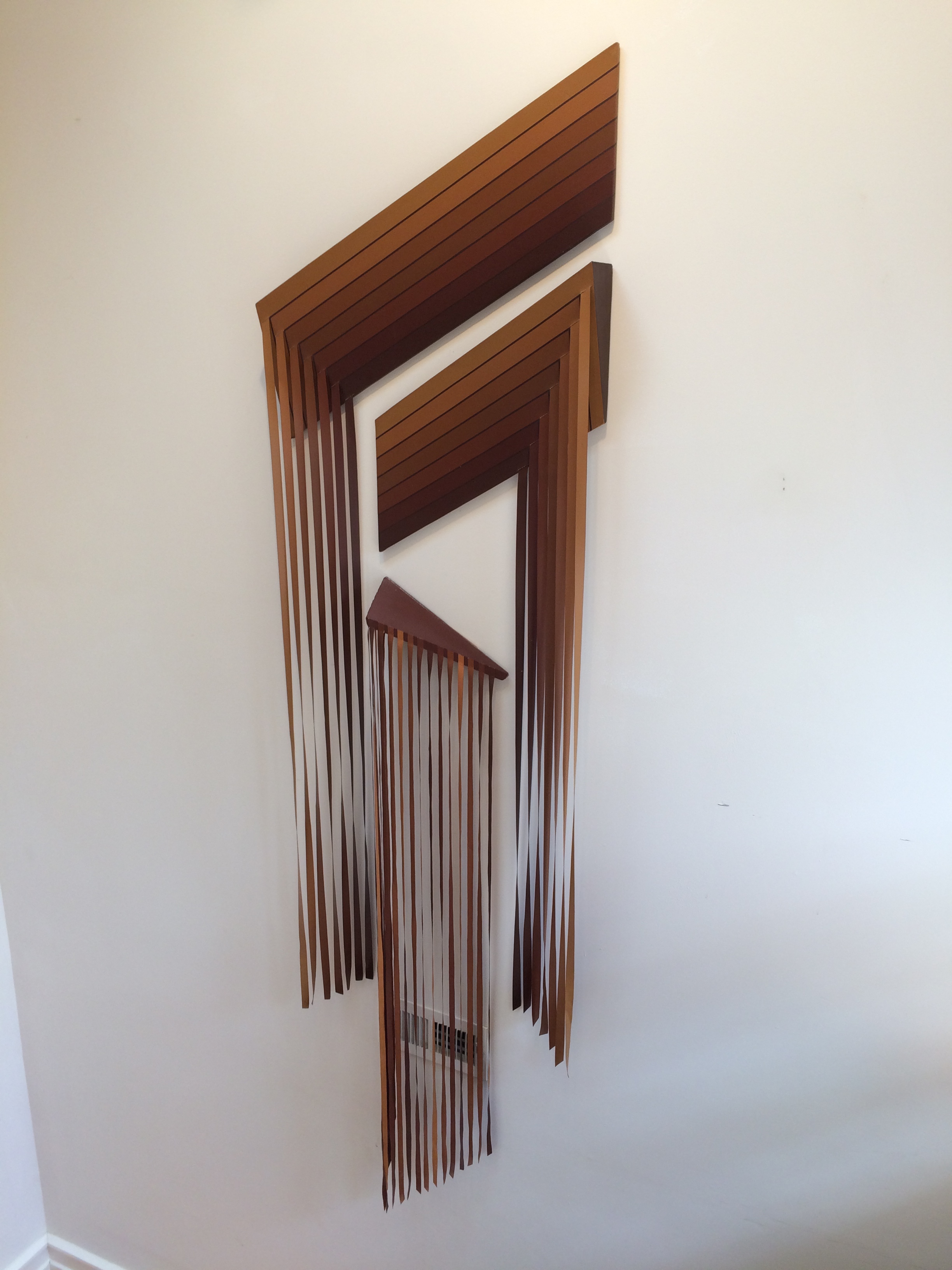 interesting relationship between the paintings and walls, ribbons and floor. Light from windows and lamps stacks out the color, and creates a second “shadow painting.” The angles of the pieces hung in relation to his home. Much of Gil’s early work was done on huge shaped canvases with an emphasis on line (think Frank Stella). He talks about the evolution from these paintings to what we will be seeing at Ground Floor: “I was doing these Stella-like paintings and started thinking- what if the color just left the canvas