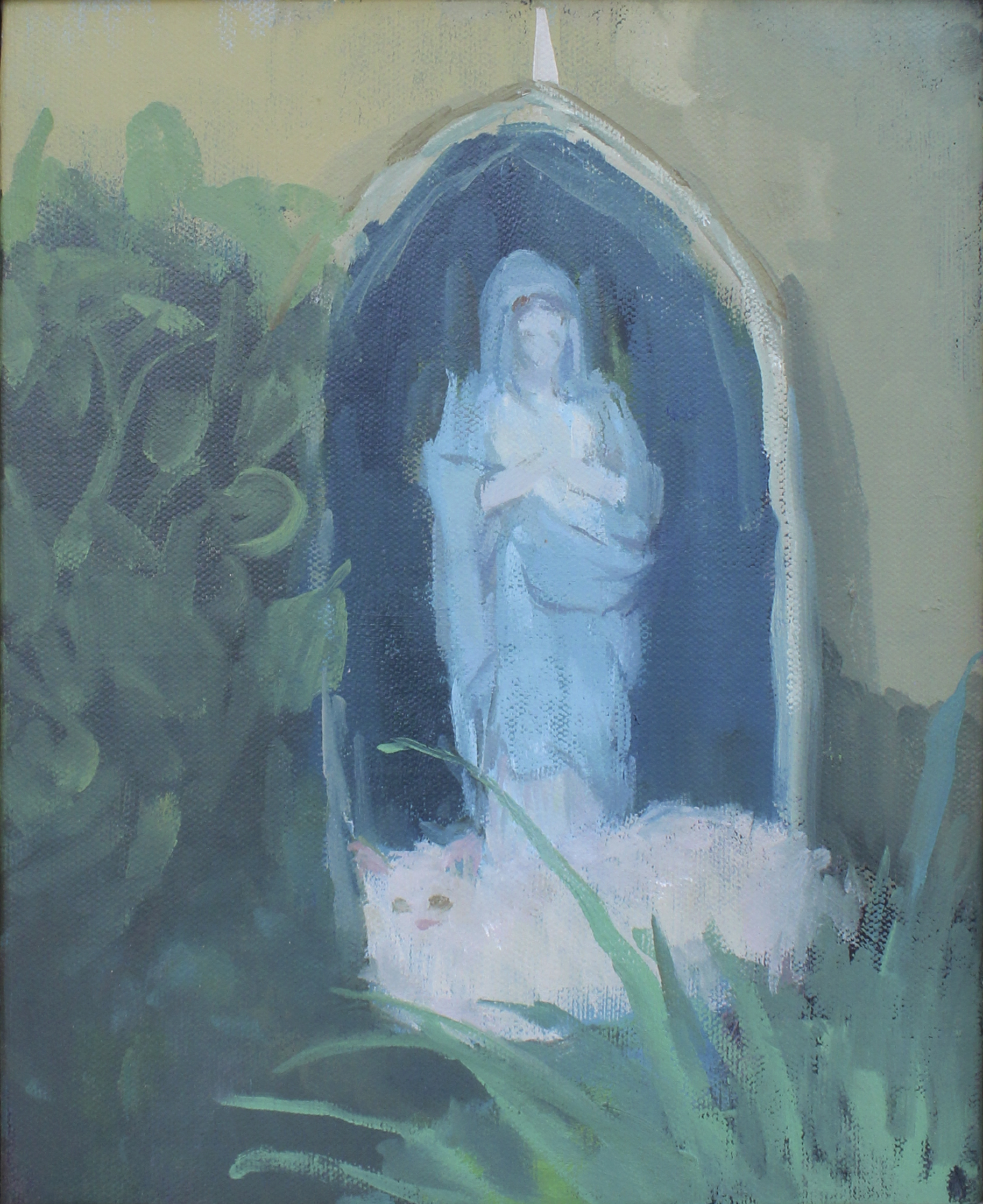 Garden With White Cat and Mother Mary